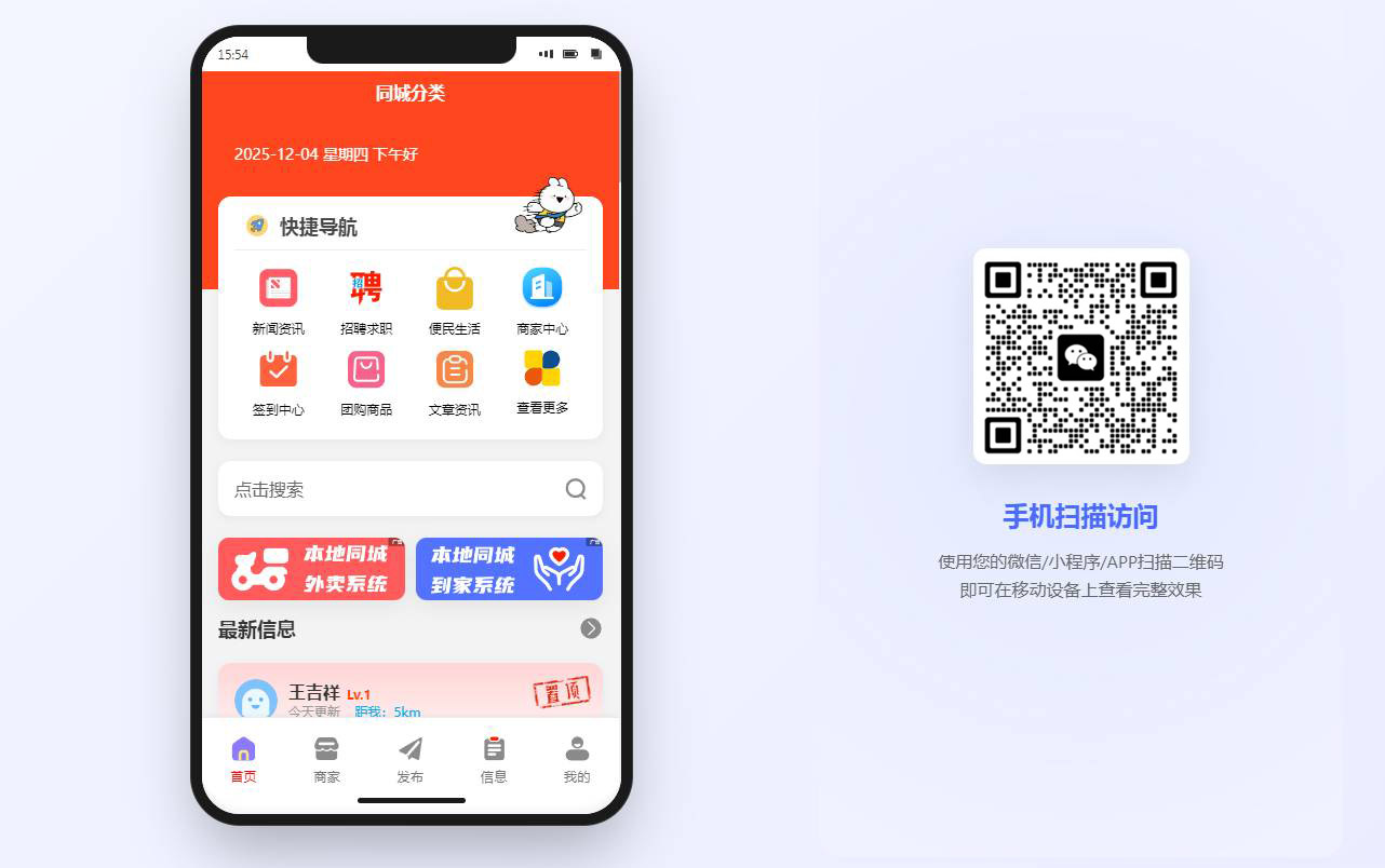 - 推广功能:支持信息付费刷新(后台设置刷新金额)、付费置顶(提供5天/30天/120天等套餐,价格可后台配置,支持叠加购买),提升信息曝光位置;