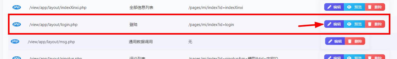 在后台页面管理中,找到“登录模板”选项,点击其对应的“编辑”按钮,进入代码编辑界面,编辑界面如下: