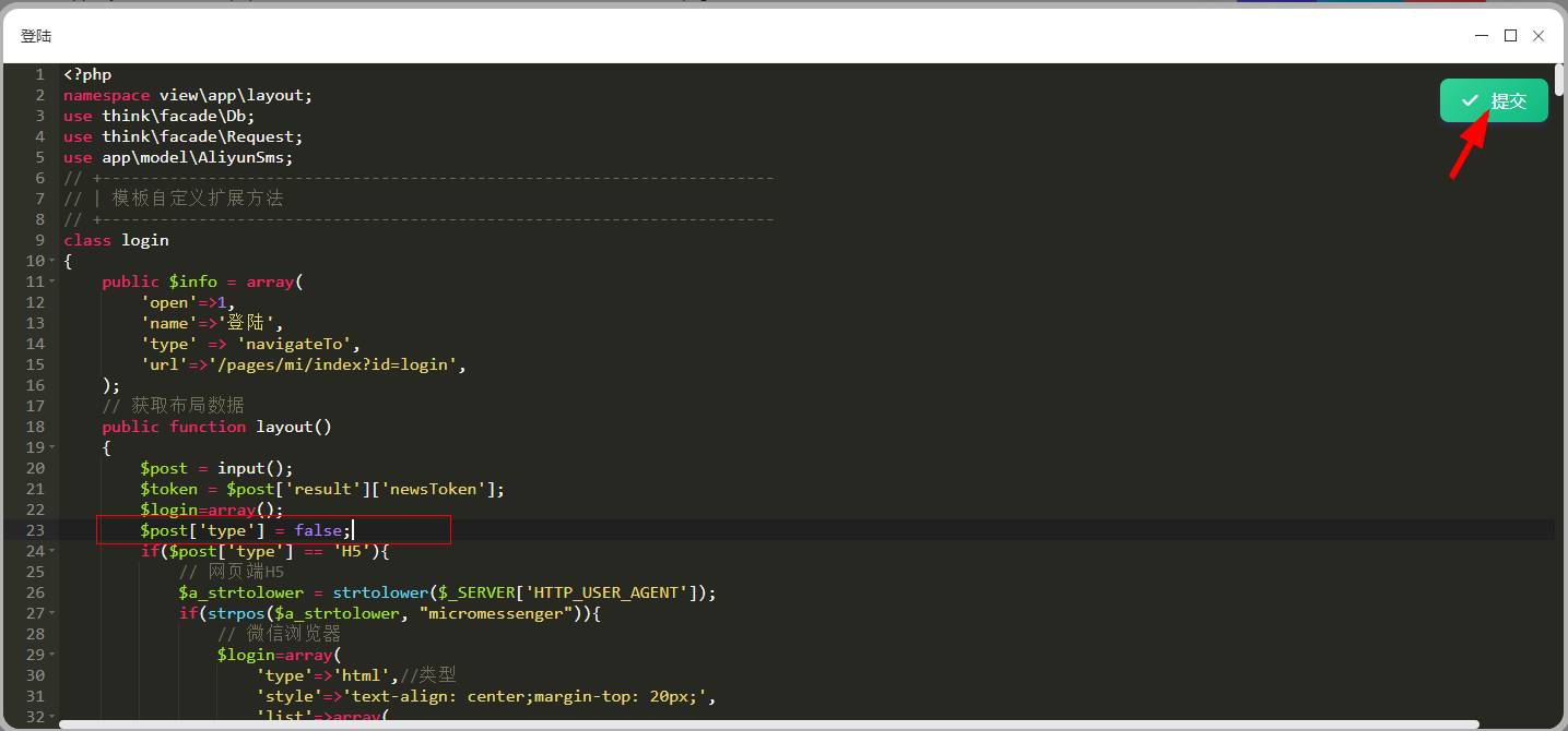 在代码编辑区域内,找到if($post['type'] == 'H5'){这一行代码,将以下代码添加到该行的上方:$post['type'] = false;代码添加的具体位置示意如下,确保代码插入位置与图示一致: